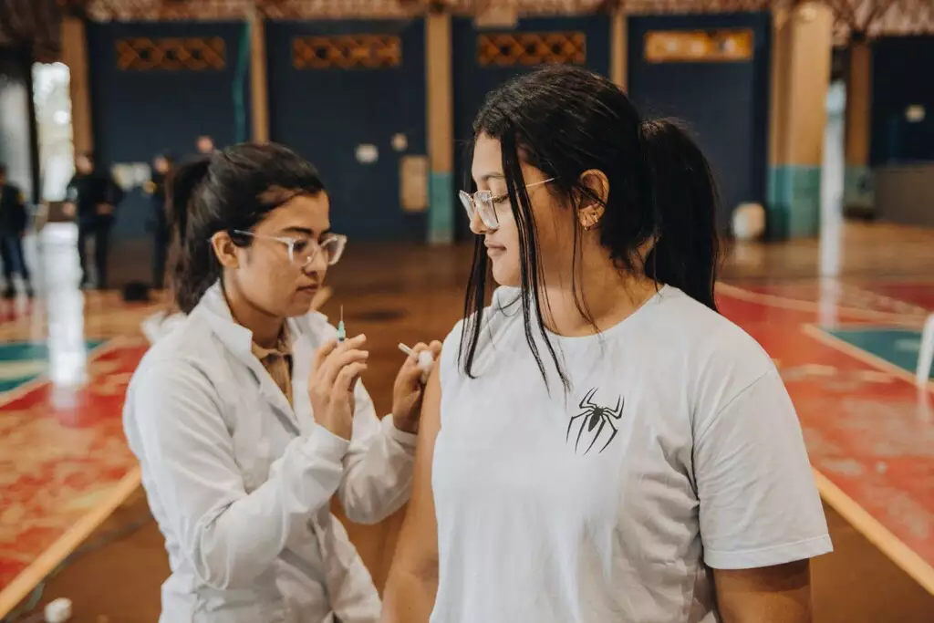Agente da Sesau vacina jovem em ponto de vacinação na Capital (Foto: Divulgação).