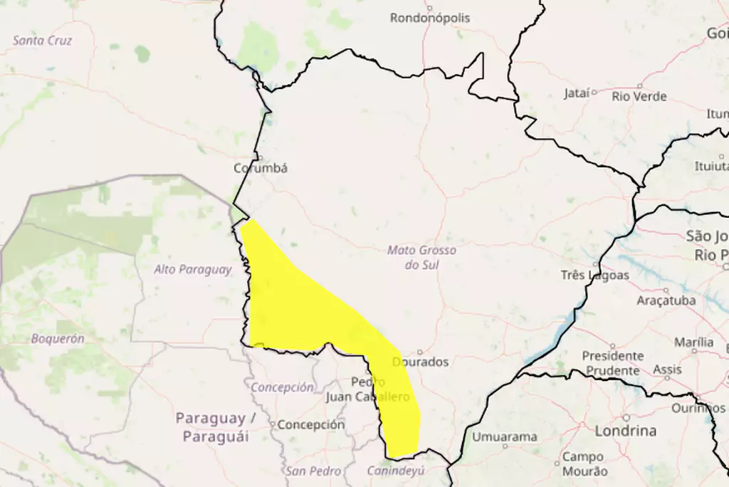 O aviso vale para os municípios de Amambai, Antônio João, Aral Moreira, Bela Vista, Bonito, Caarapó, Caracol, Coronel Sapucaia, Corumbá, Dourados, Guia Lopes da Laguna, Iguatemi, Jardim, Laguna Carapã, Maracaju, Paranhos, Ponta Porã, Porto Murtinho, Sete Quedas e Tacuru. Em caso de necessidade, a população pode acionar a Defesa Civil (199) ou o Corpo de Bombeiros (193).